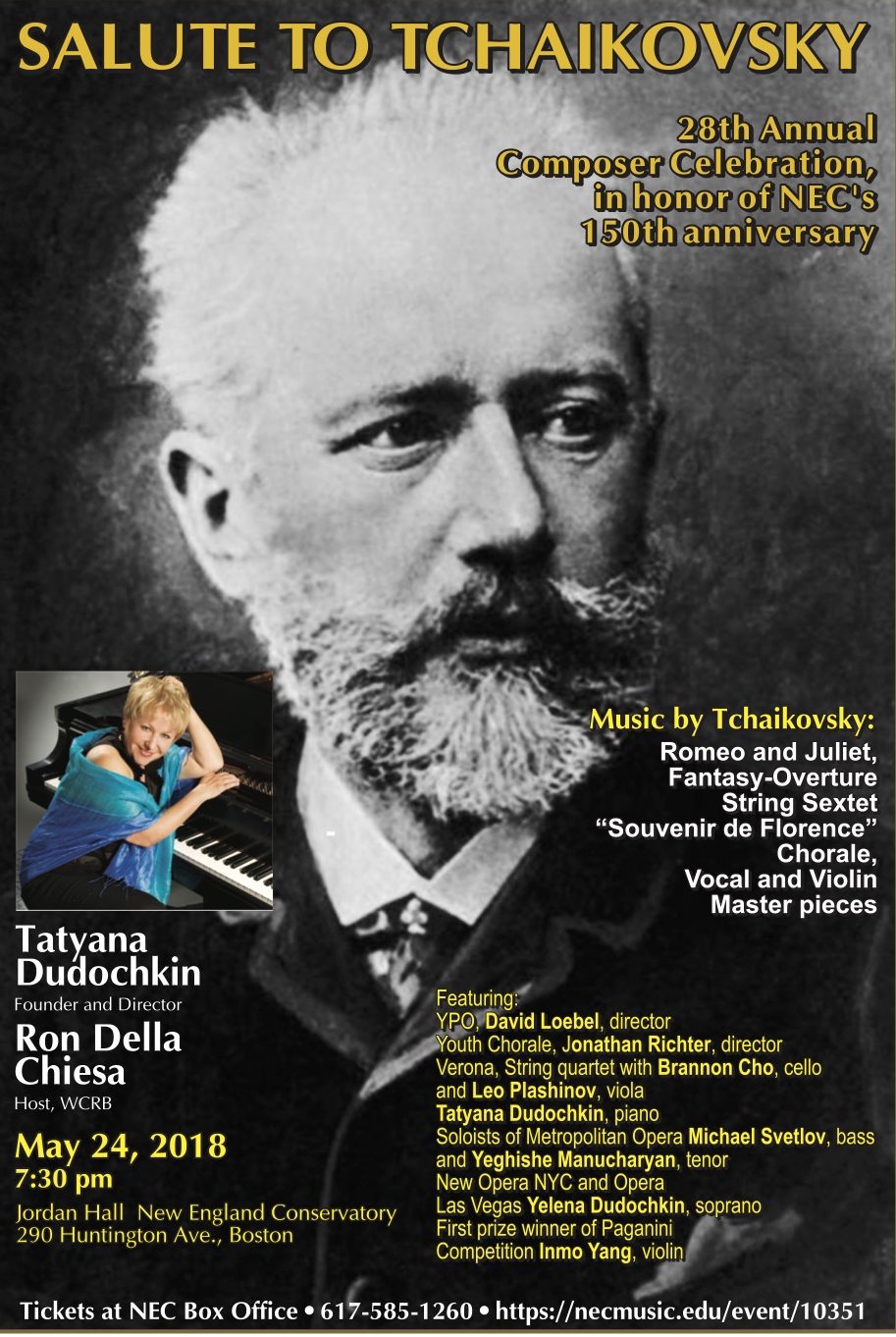 Chamber Music Foundation of New England Season Opening concert features Yelena Dudochkin soprano, Tatyana Dudochkin, piano, Heechan Ku, cello, Huyn Ji Lee, violin, and Channing Yu piano. Works by Eastern European Composers highlight passion, longing and excitement for life -Arensky, Rachmaninoff, Popper, and Skoryk round out the program.